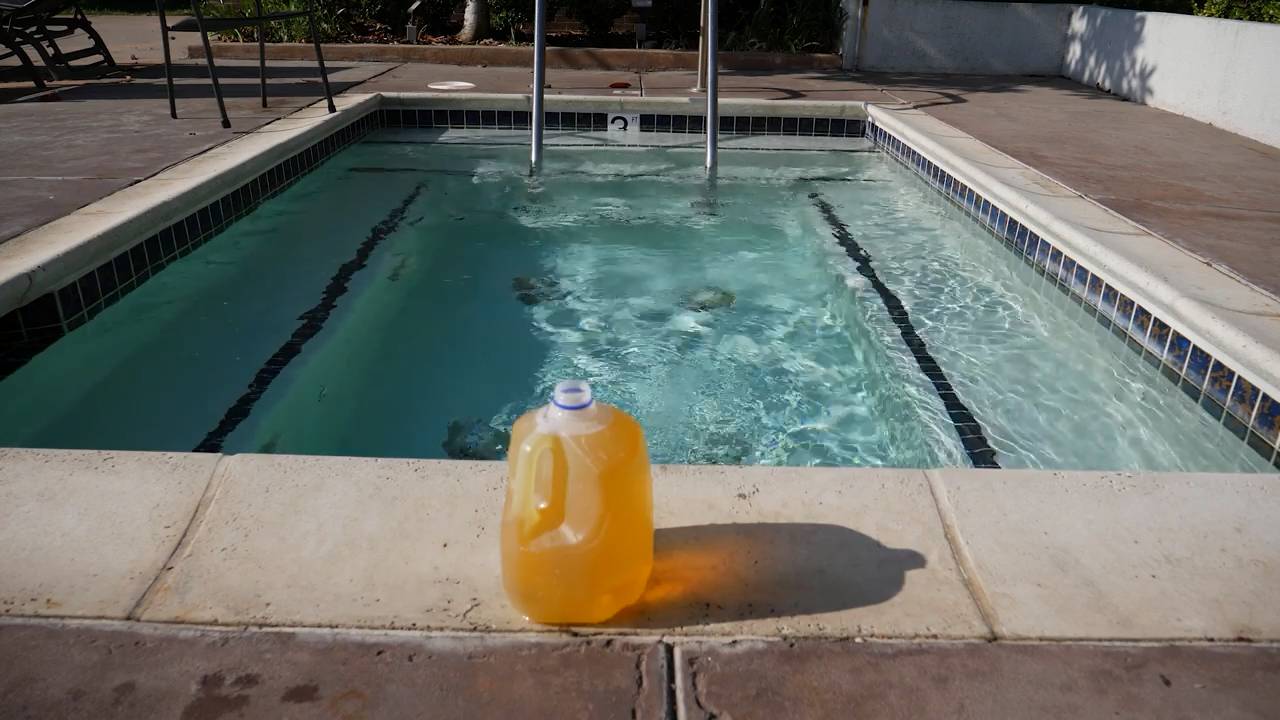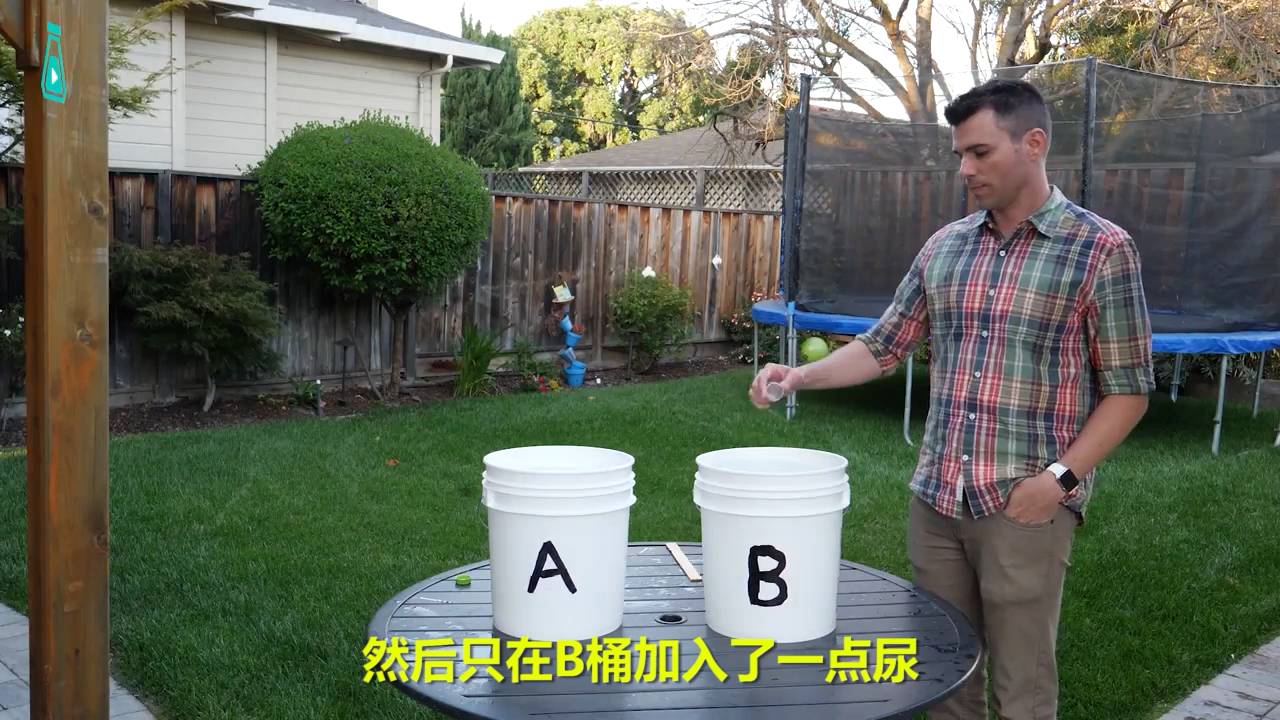 為了驗證這一說法,Mark親自測試了一下。他準(zhǔn)備了兩桶各約18升的純水,然后各自加入高于標(biāo)準(zhǔn)濃度4倍的消毒用氯,接著在其中一個水桶內(nèi)加入了一點(diǎn)尿。