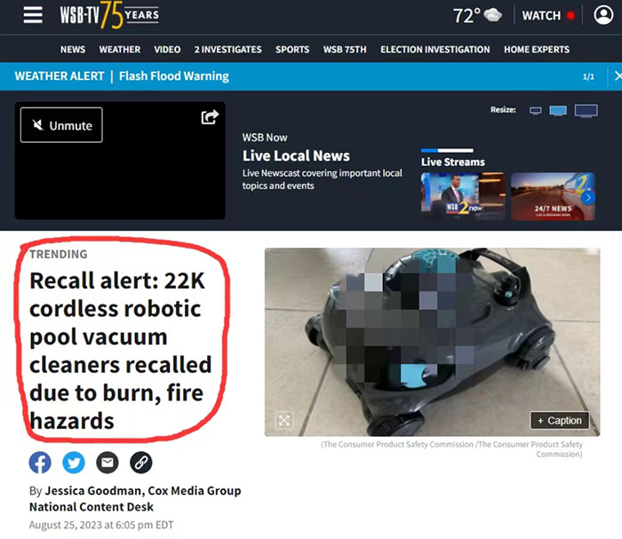 22000臺(tái)充電吸污機(jī)因火災(zāi)隱患被召回,無(wú)線泳池吸污機(jī)使用安全引關(guān)注!