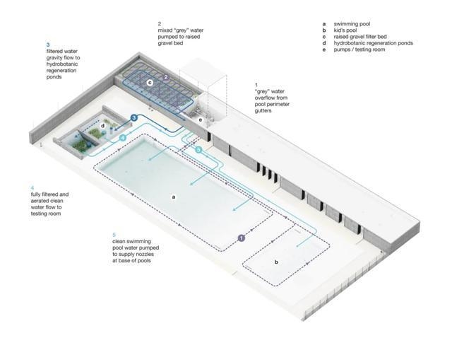 加拿大對于公共泳池的規(guī)定可能是世界上最嚴(yán)格的,所以為了實(shí)現(xiàn)該項(xiàng)目的建筑要求,設(shè)計(jì)師創(chuàng)造性的將該項(xiàng)目分類為“人造水體”,周邊建筑作為“可變的人造沙灘”。該泳池包含了一個平衡的生態(tài)系統(tǒng),植被,微型有機(jī)物,營養(yǎng)物質(zhì)可以在砂礫和沙子過濾過程中進(jìn)行結(jié)合,從而產(chǎn)生“有生命力的水體”。