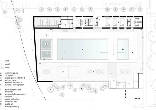 該建筑包含通用的更衣室,淋浴間,衛(wèi)生間,辦公區(qū)以及水體過濾設(shè)備。游泳項(xiàng)目包含兒童泳池,深水區(qū),陸上室外淋浴區(qū),沙灘,野餐區(qū)以及用于其他與泳池相關(guān)的休閑活動的空間。