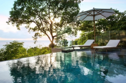 室外無邊泳池面朝大海,從這里可以遠眺周圍其他島嶼。別墅更配有私人泳池,四周被密林包圍擁有極高的私密度。