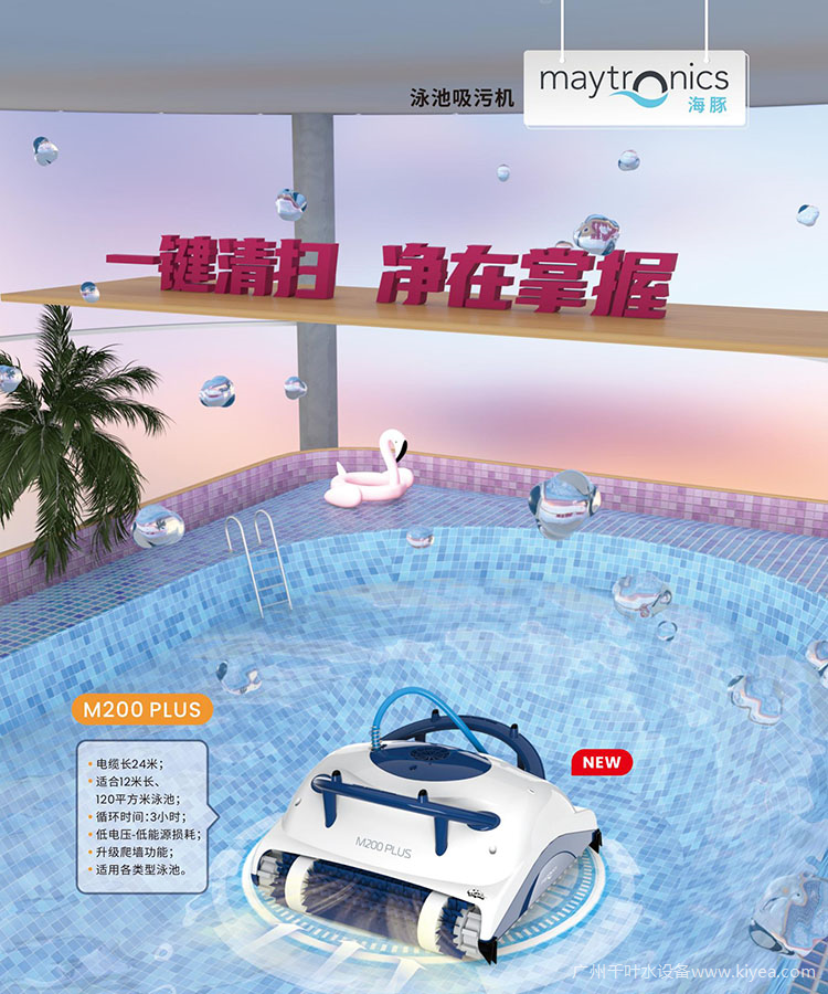 在泳池清潔設(shè)備方面,廣州千葉全新引進Maytronics海豚雪豹POOL up、M200 plus、S100、M550、wave90i等多款泳池自動吸污機。Maytronics海豚泳池吸污機M200 plus升級爬墻功能,一鍵啟動就可自動刷洗池底池壁,主動清潔藻類和細菌,并且自帶精密過濾袋全面去除污垢雜質(zhì),實現(xiàn)智能高效清潔;采用輕量化設(shè)計、防纏結(jié)電纜,使用安全方便。